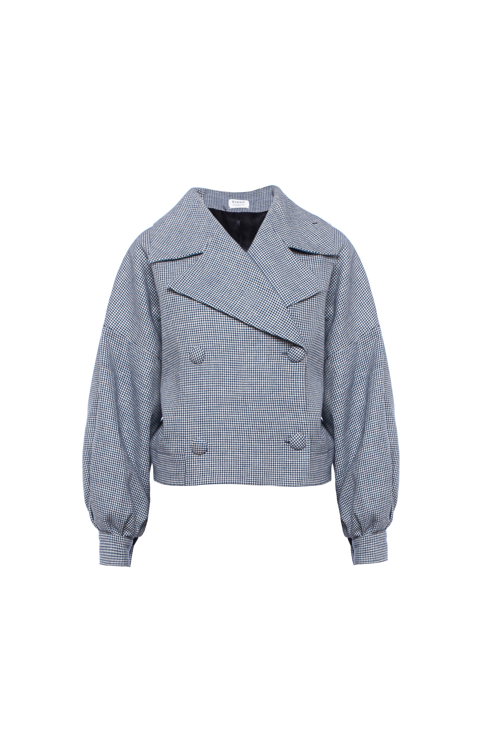 Chaqueta de silueta recta con solapa cruzada y botones forrados.Tiene grandes mangas plisadas en el puño. Vístela en conjunto con el pantalón Gala en el mismo tejido de pata de gallo.