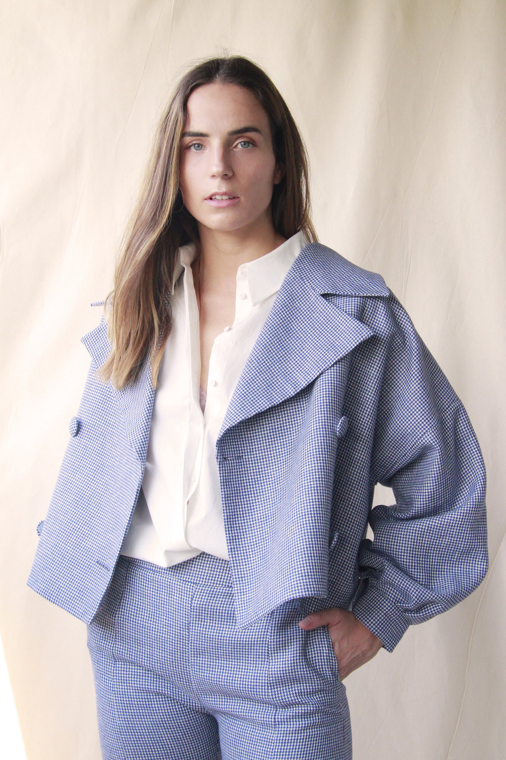 The Gala jacket is part of our ideal set of matching jacket and pant made out of a micro houndstooth fabric. We wanted to make a special suit keeping our characteristic silhouette with wide sleeves and square patterns. The result is a light and original suit that juxtaposes classic components together with current trends.